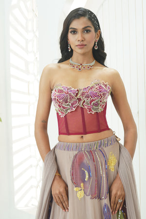Mauve Hand-Painted Lehenga & Floral Corset Set