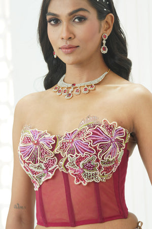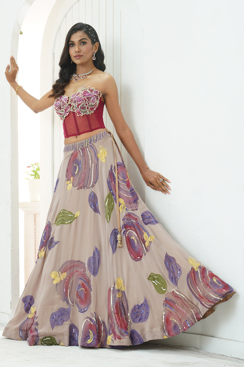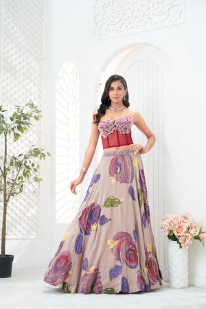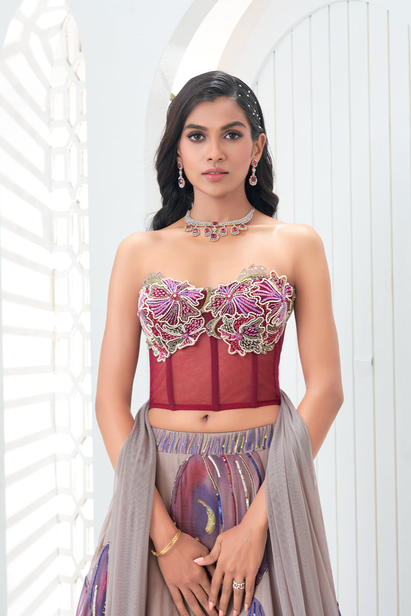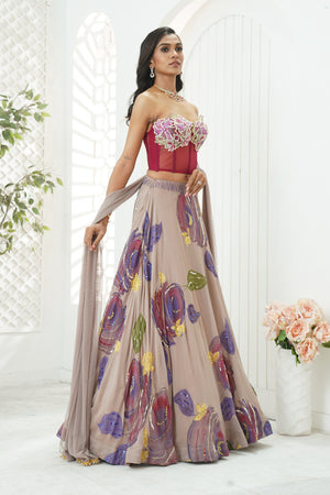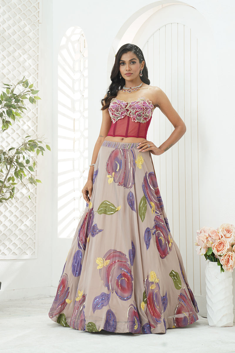 Mauve georgette hand painted and hand embroidered lehenga with Burgundy floral embroidered corset and dupatta set.