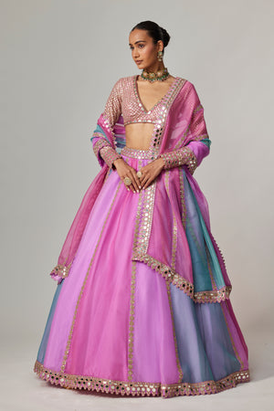 A Vibrant Multicolor Lehenga In Mauve, Aqua And Dark Blush Tones, Adorned With Golden Gota Embroidery, Paired With A V Neck Full Sleeve Blouse.