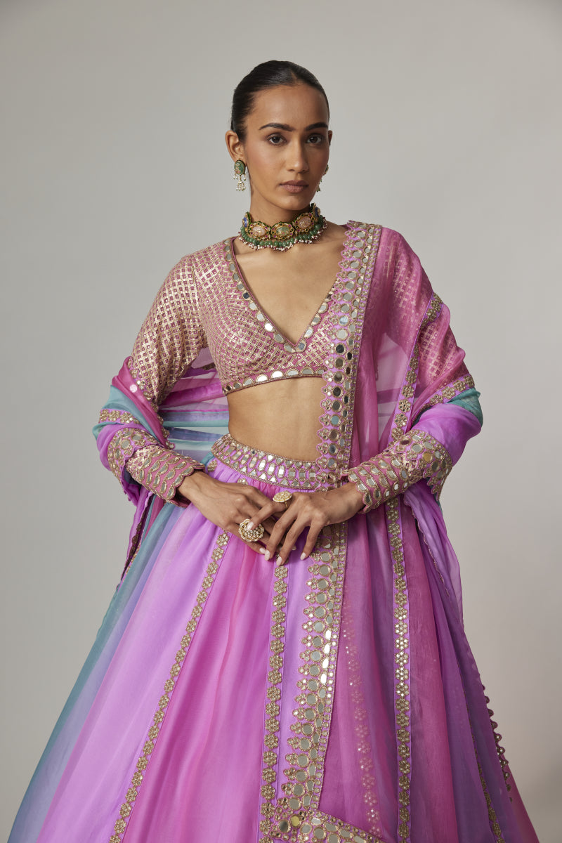 MAUVE MULTICOLOR LINEAR LEHENGA WITH V NECK BLOUSE