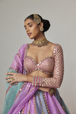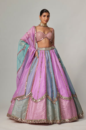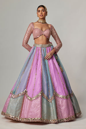 A Vibrant Multicolor Organza Lehenga In Mauve, Aqua And Dark Blush Tones, Adorned With Golden Gota Embroidery, Paired With A Full Sleeve Blouse.