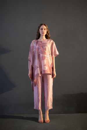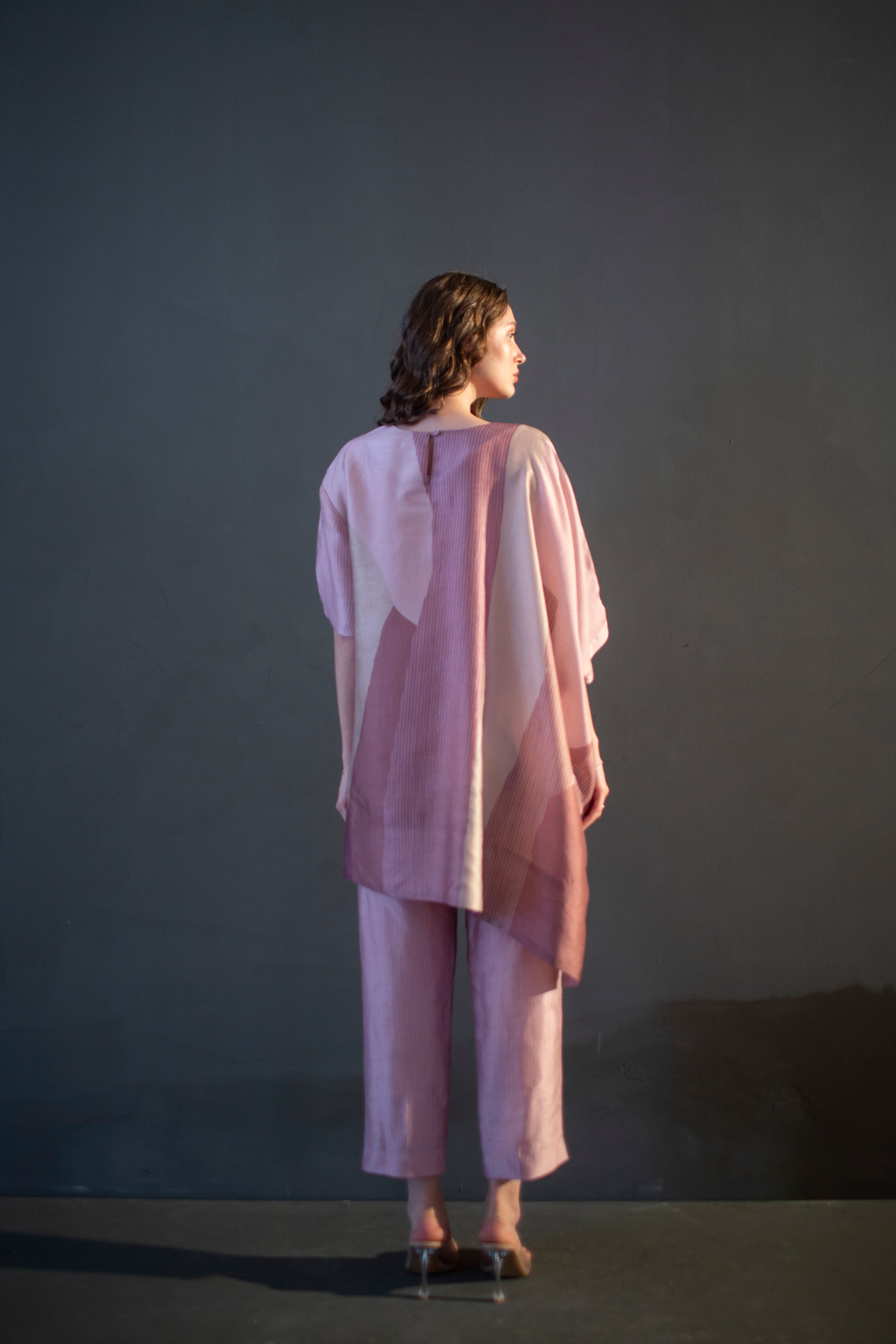 A two piece dupion silk set comprised of abstract geometric and floral print in playful color compositions and parallel pants with fusion textiles.