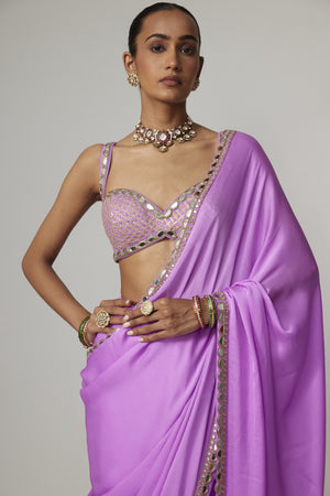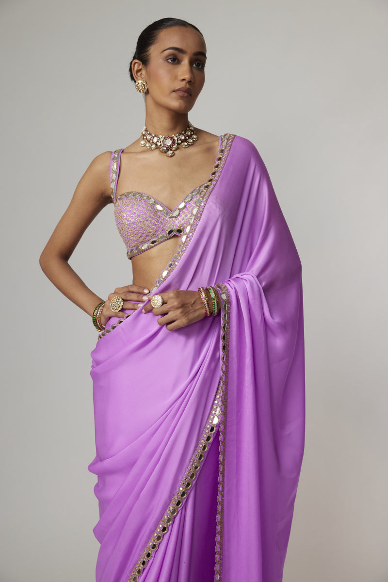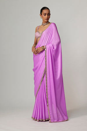Mauve Satin Saree Paired With A Golden Gota Embroidered Sweetheart Neck Blouse
