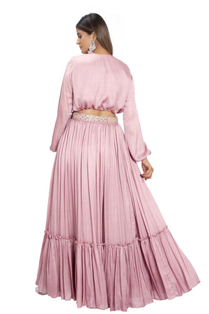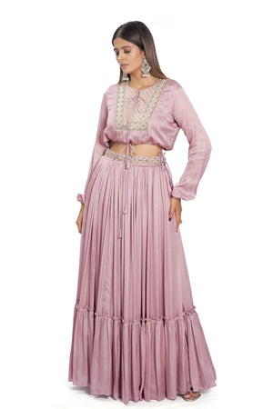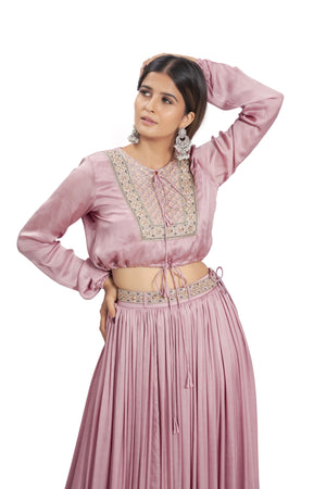 Featuring a mauve loose top in satin base with an adjustable waist line and hand embroidery. It is paired with a matching skirt. Perfect wear for festive occasions or wedding ceremonies.