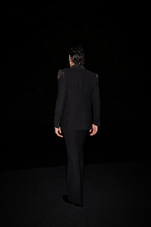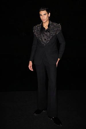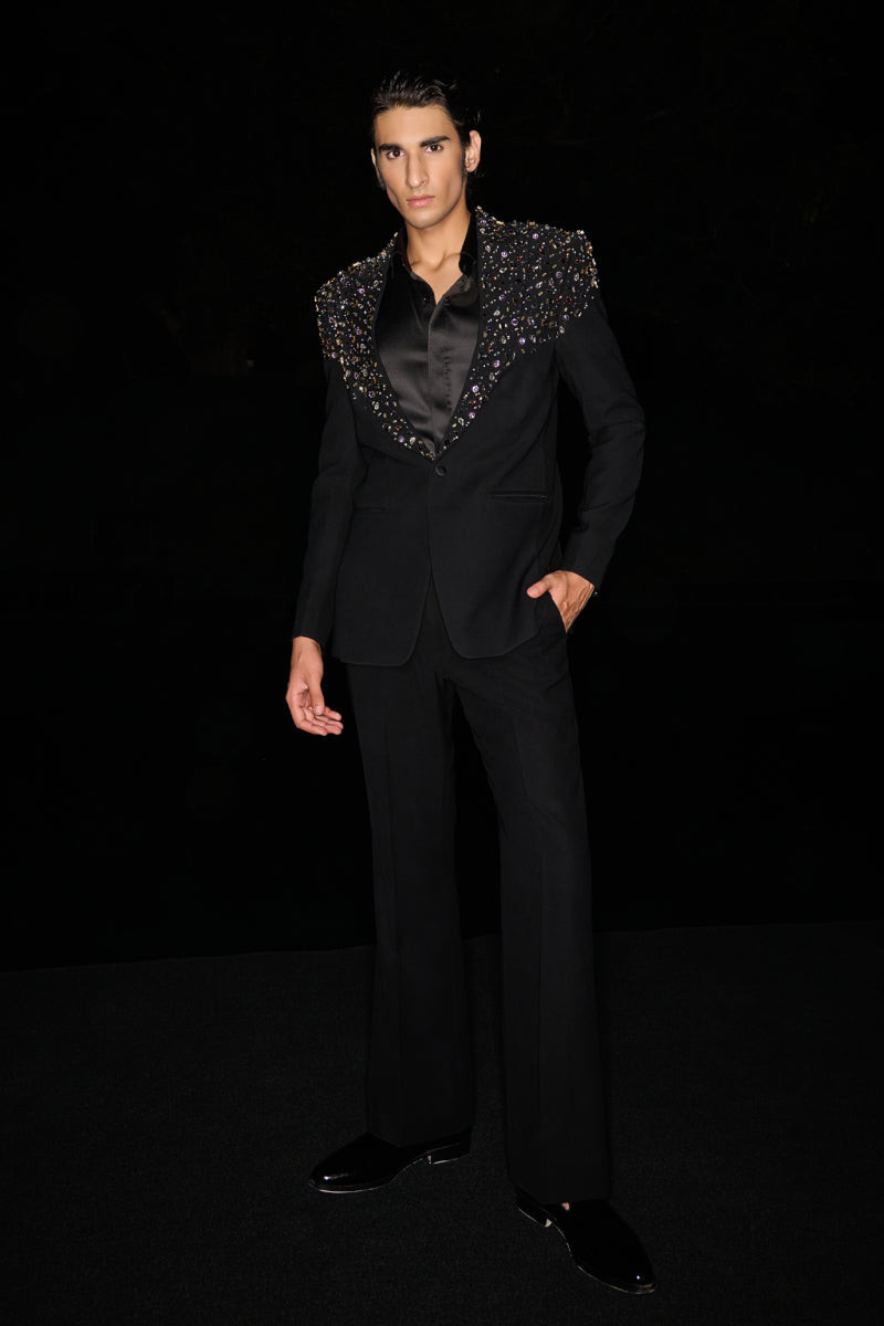 A heavily embellished tuxedo adorned with vibrant colored stones and crystals, paired with a shirt and pants