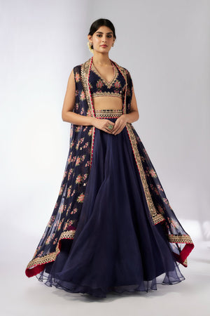 The outfit in the image is an elegant navy blue lehenga set, featuring a halter-neck choli with intricate floral embroidery and a matching flowy skirt. The ensemble is complemented by a beautifully embroidered dupatta, making it a perfect choice for festive celebrations and traditional events.