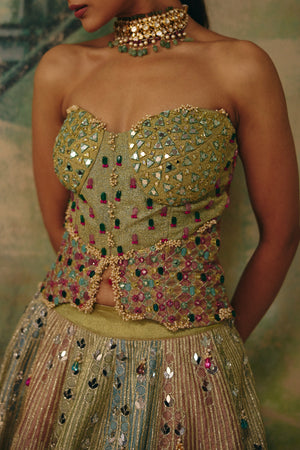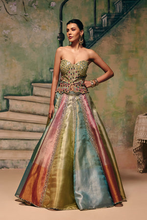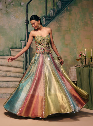This luminous lehenga features a sculpted strapless blouse adorned with intricate mirror work and fine embroidery, creating a striking couture silhouette. The voluminous skirt is crafted in soft pastel organza chanderi panels with shimmering sequin accents for a fluid, radiant finish. Delicate detailing along the waist adds a touch of artisanal finesse. A perfect blend of modern glamour and festive elegance, designed to make a graceful statement.