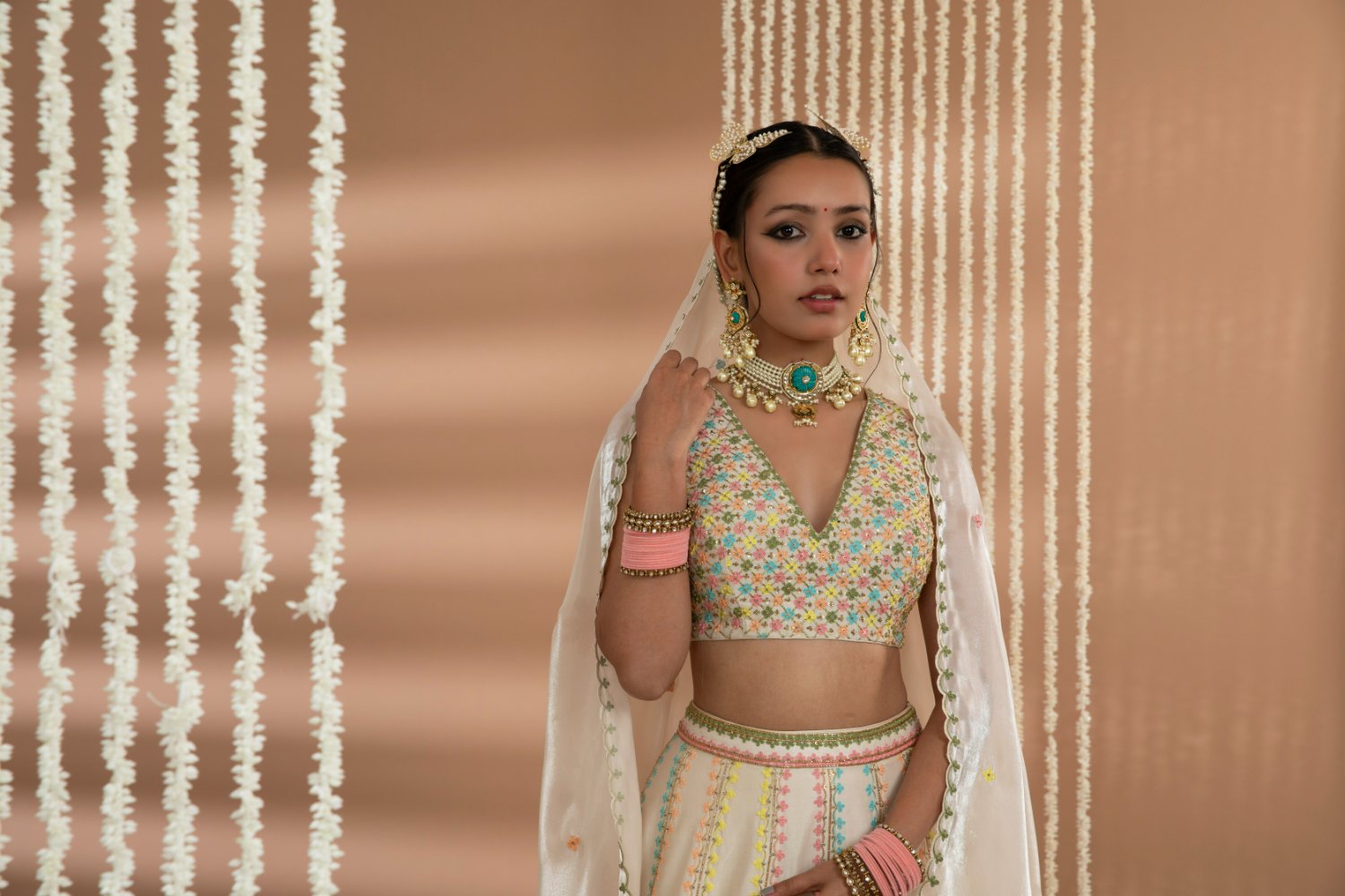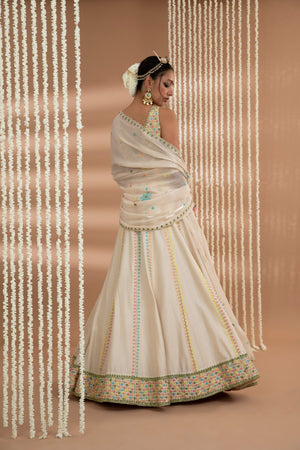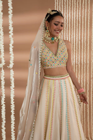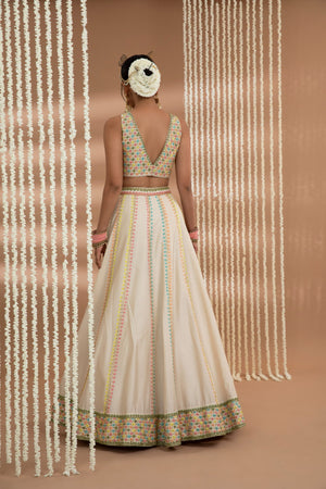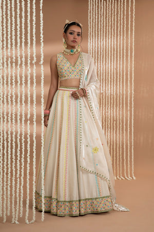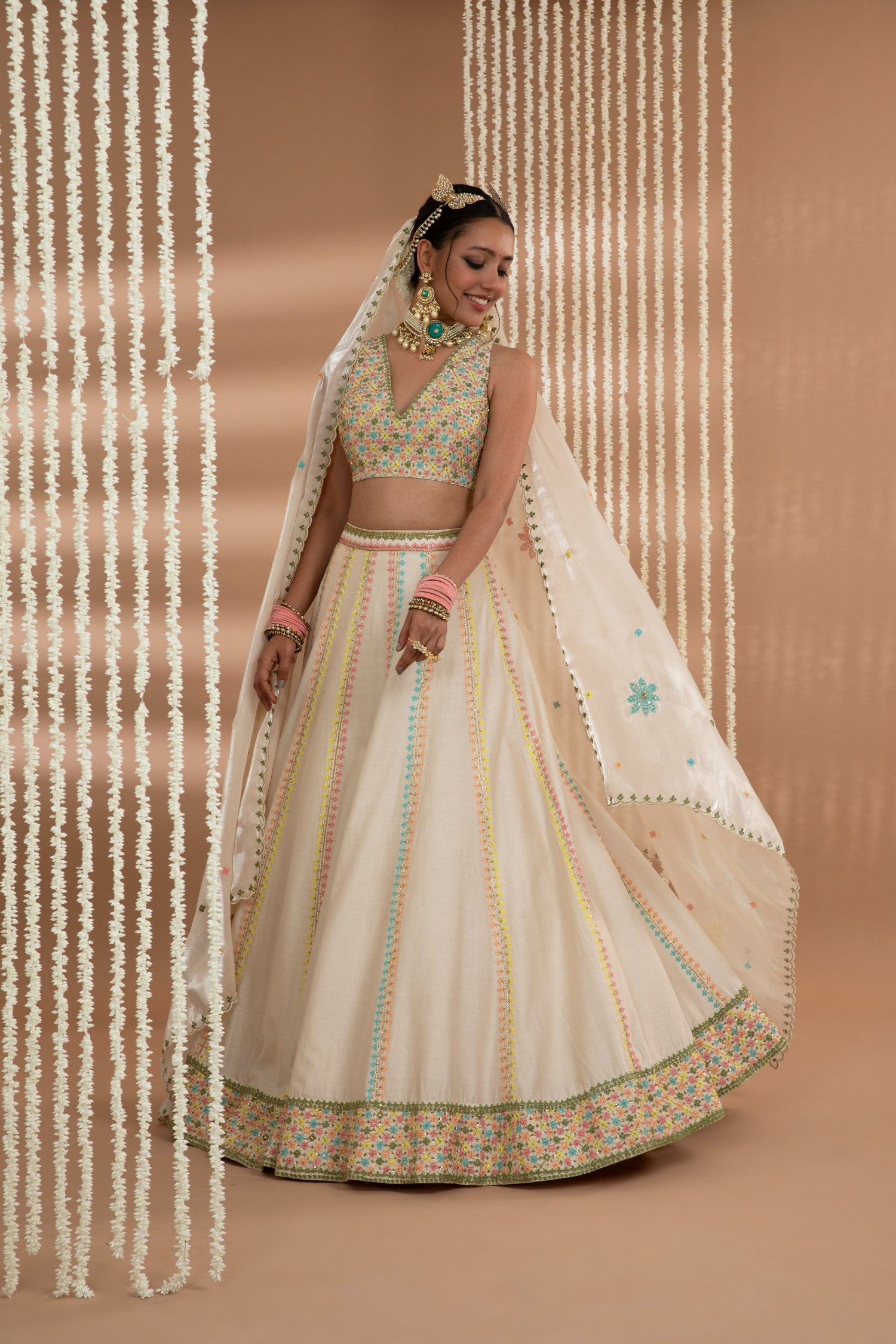 Featuring a timeless ivory lehenga set in chanderi with colourful resham embroidary highlighted with hand work. Each kali is highlighted with embroidaries beautifully. Paired with matching blouse with jaal embroidary and hand work and glass silk dupatta with scallop finishings.
