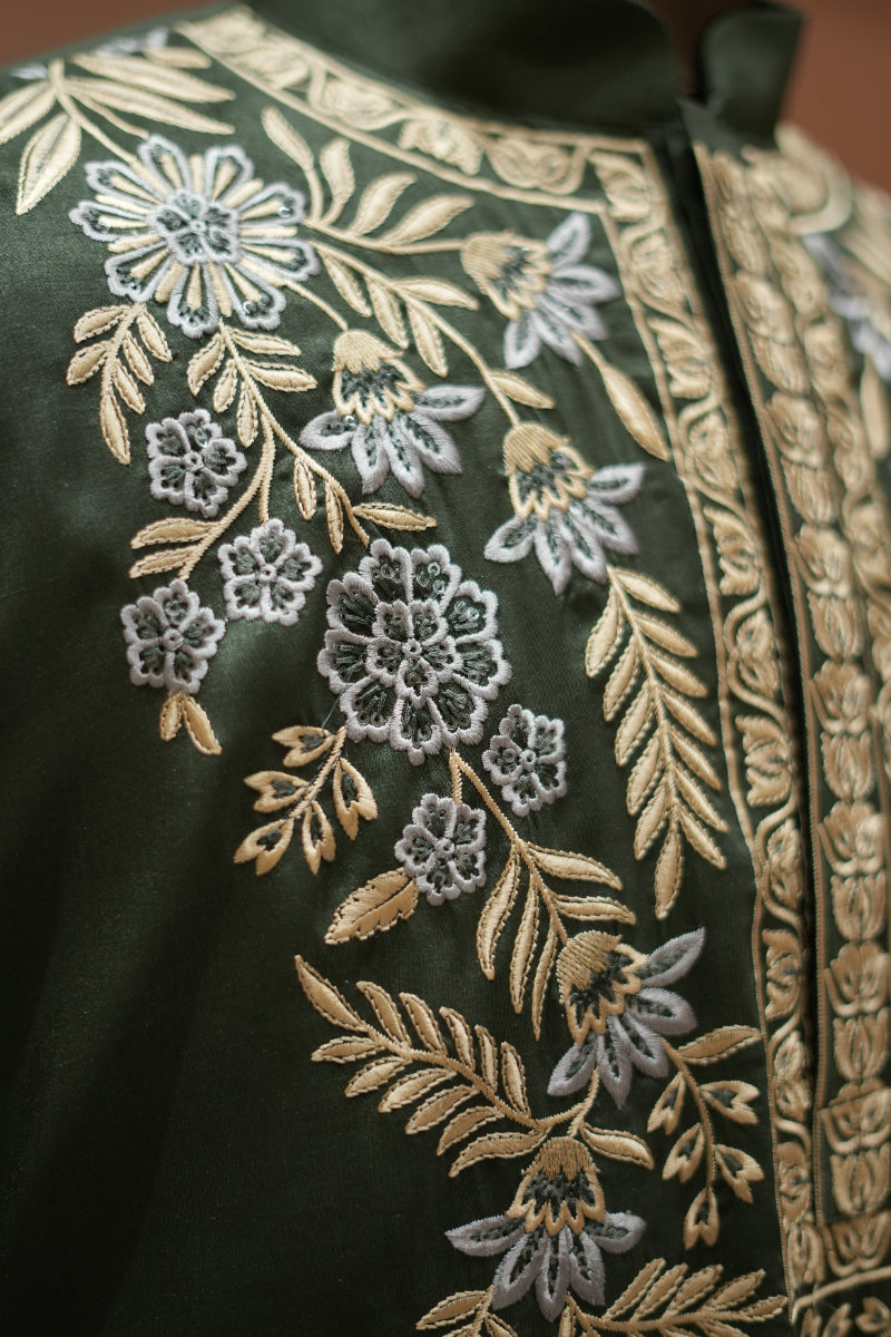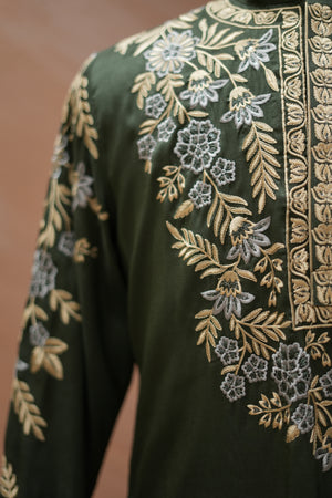 Featuring a dark green colour kurta with hand embroidery. It is paired with white pants. Perfect attire for any festive occasion exuding traditional charm and timeless elegance.