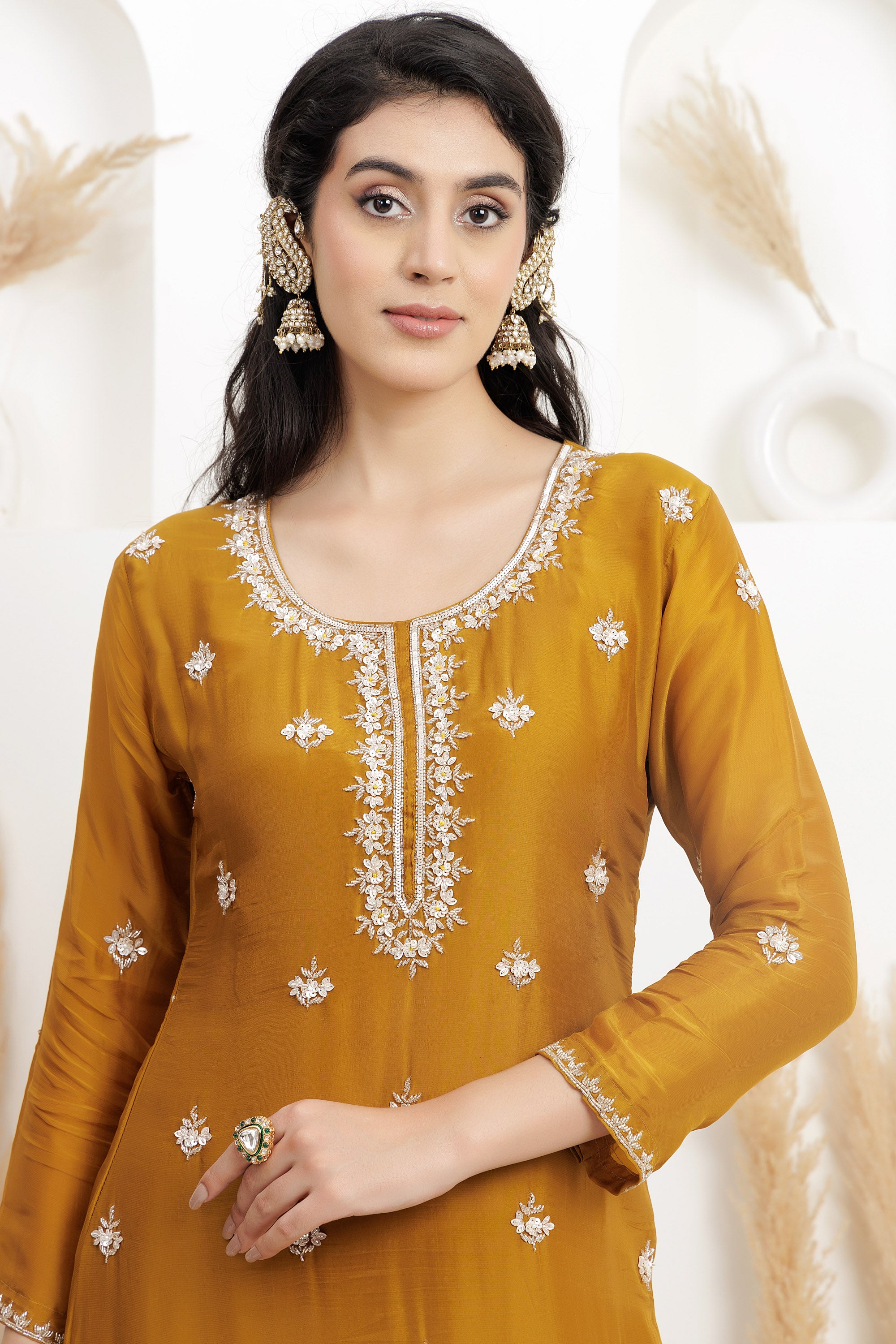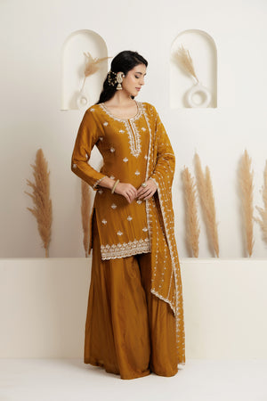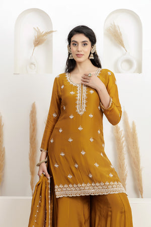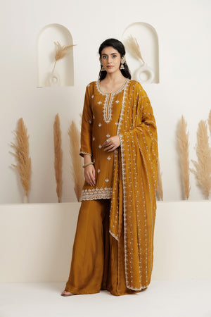 Mehendi Green kurta in satin silk base with cutdana, pearl and sequins embroidery. It is paired with sharara pants and a pure organza heavy dupatta. Accentuate with statement earrings and heels for a festive occasion or sangeet ceremony.
