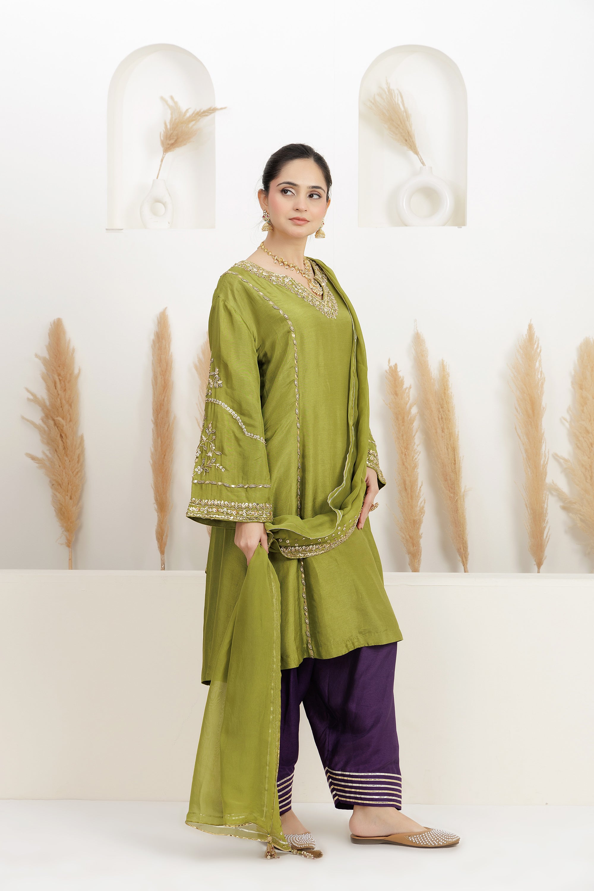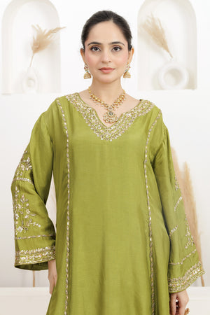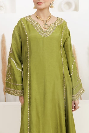 Mehndi Green A line Short Suit comes Gota Salwar and Pure Organza Embroiderd Dupatta.