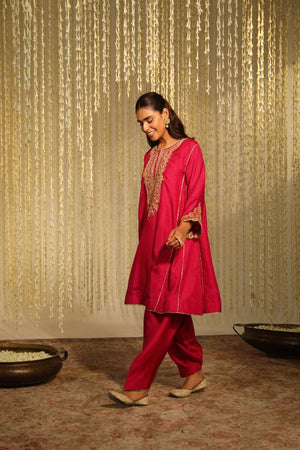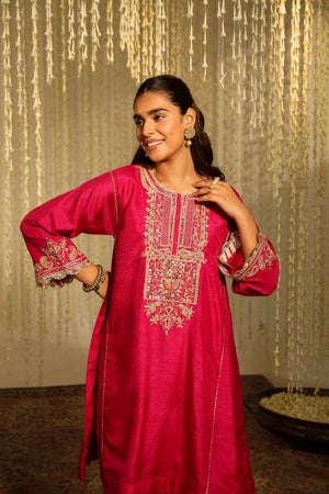 This Meher ensemble is made in pure silk fabric. The outfit is adorned with kirandori embroidery and sitaara. This ensemble is having a zero neck with slit and three-quarter bell sleeves. The kali is finished with kinari. This outfit comes with a dogri salwar. The whole oufit is finished with a contrast banarsi fabric.