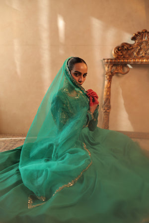 Step into timeless elegance with this sea green Anarkali, drenched in vintage charm. Intricately embroidered on the front, sleeves, and back, it captures the artistry of a bygone era in every detail. Flowy, flattering, and rich in heritage — it's a classic reimagined for today’s celebrations.