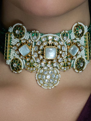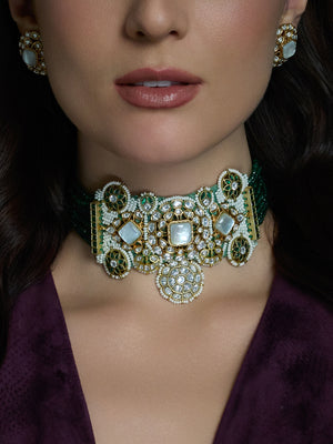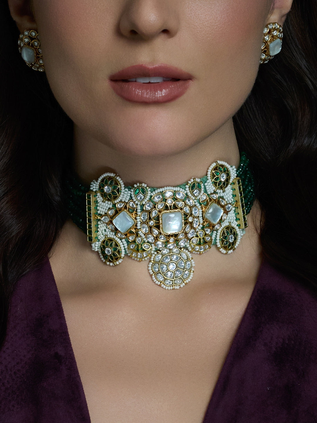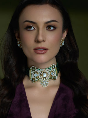 Grab attention with this regal green thread choker, studded with dazzling stones and paired with elegant earrings. Designed to evoke heritage, power, and refined beauty in every look.