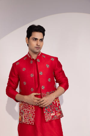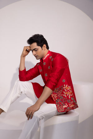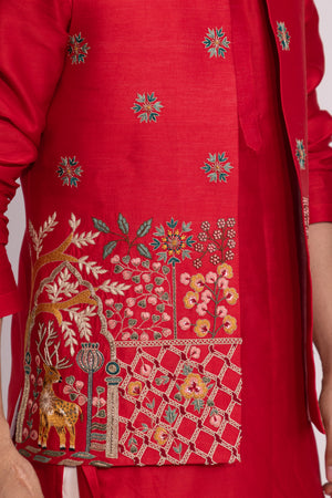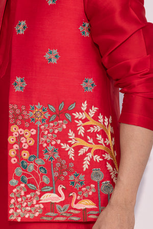 Jacket is adorned with small, scattered floral motifs. The lower half of the jacket's front panels features a denser and more complex design. One side has a rich, patterned embroidery with geometric and possibly paisley elements, while the other side depicts a detailed, nature-inspired scene with a bird, stylized trees, and flowers. The embroidery uses a wide range of colors, including gold, green, blue, and pink, creating a festive and luxurious look.