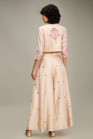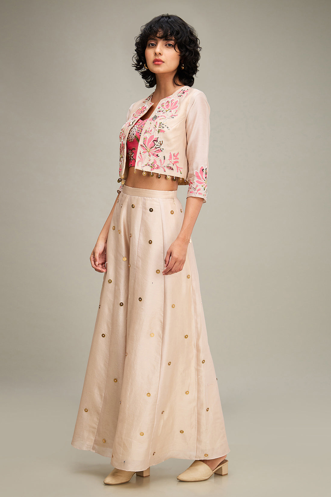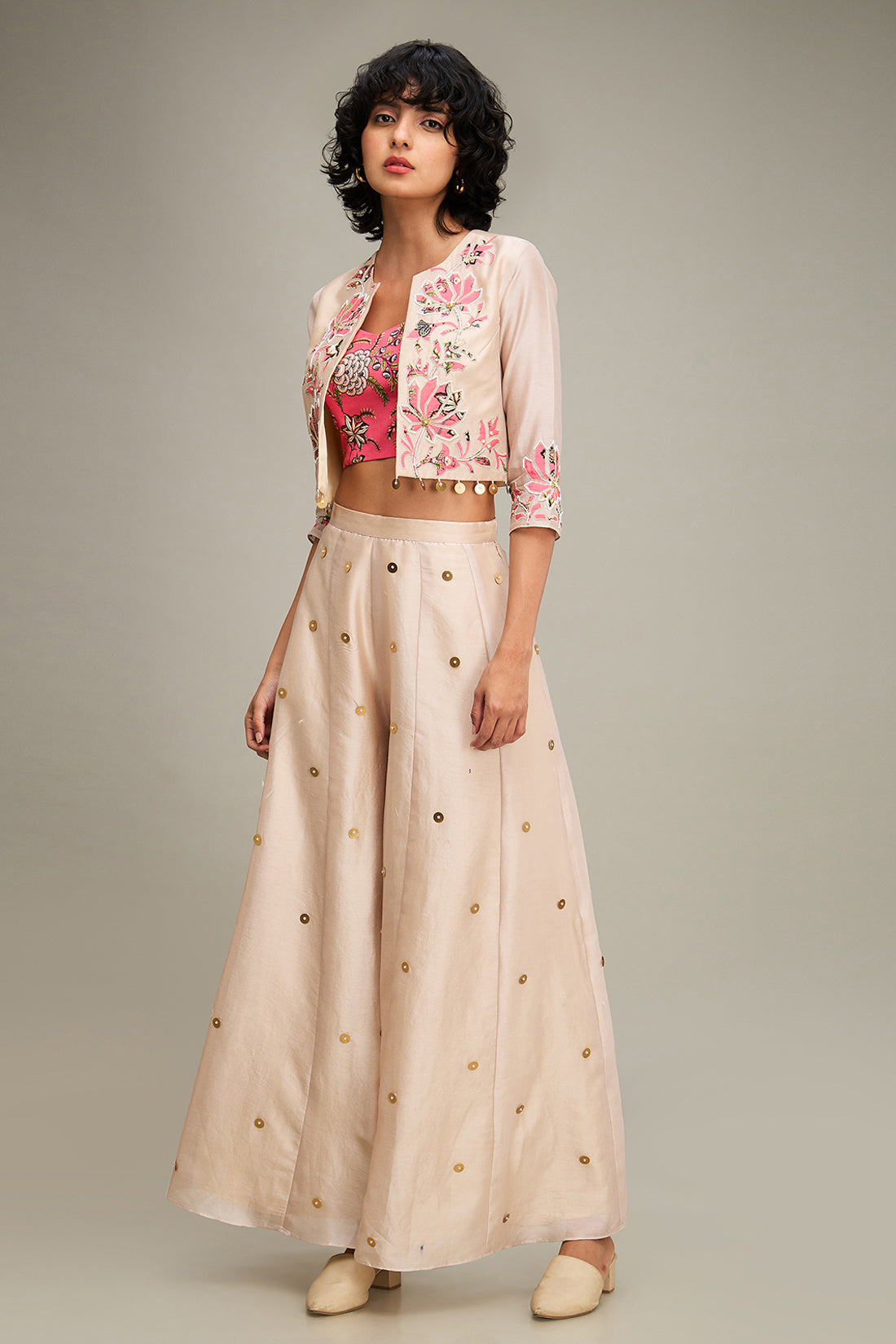 Beige Mehr Printed Bustier And Pants Paired With Applique Jacket In Chanderi.