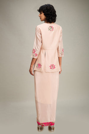 Pink Mehr Applique Paneled Top paired With drape skirt in Chanderi.