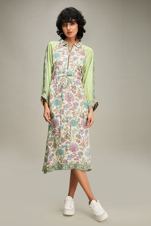 Multicolor Embellished A-line Flared Long Dress with Waist Tie-up in Satin.