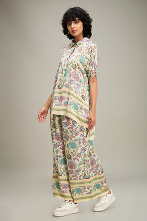 Multicolor Mehr Print High-low Top with Straight Pants in Satin.