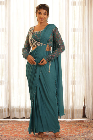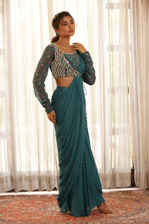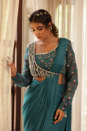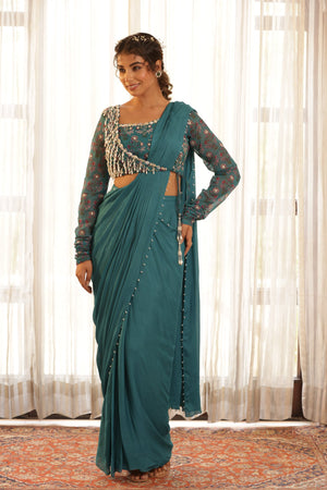 Pre Drape saree with pearl details. Paired with beautifully pearl hanging detail half jacket blouse, mirror work sleeve with gathered detail on hem