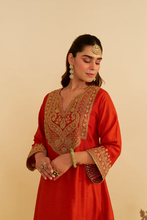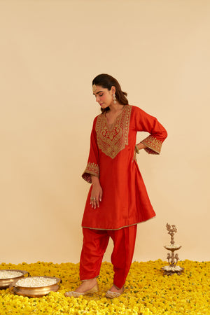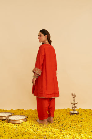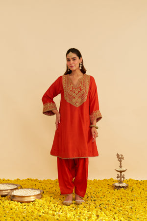 It features a zero neckline with a slit, and three-quarter bell sleeves finished with classic Kiran detailing. Paired with a traditional Dogri salwar, the outfit is completed with a contrasting Banarasi fabric, enhancing its overall opulence and timeless appeal.