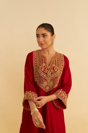 It features a zero neckline with a slit, and three-quarter bell sleeves finished with classic Kiran detailing. Paired with a traditional Dogri salwar, the outfit is completed with a contrasting Banarasi fabric, enhancing its overall opulence and timeless appeal.