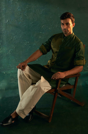 Our classic straight kurta in deep green chanderi is the perfect occasion wear. It features with a contrast stripe tisue details at pocket & placket. It is paired with a off white salwar and a green stripe nehru jacket to make it look more festive