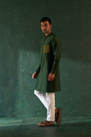 Our classic straight kurta in deep green chanderi is the perfect occasion wear. It features with a contrast stripe tisue details at pocket & placket. It is paired with cotton pants and a green stripe tissue half & half nehru jacket to make it look more festive.