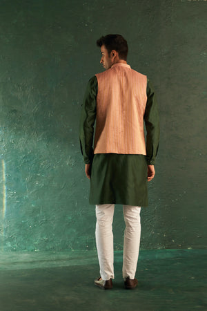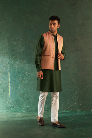 Our classic straight kurta in deep green chanderi is the perfect occasion wear. It features with a contrast stripe tisue details at pocket & placket. It is paired with cotton pants and a rose pink stripe tissue nehru jacket to make it look more festive.