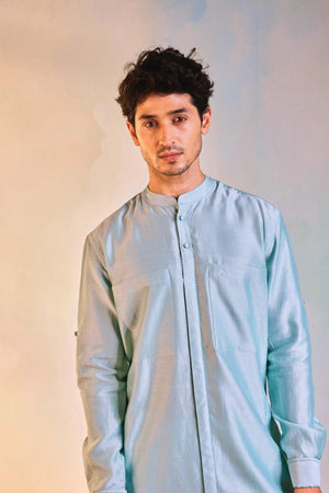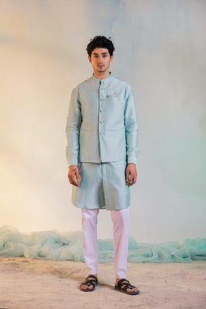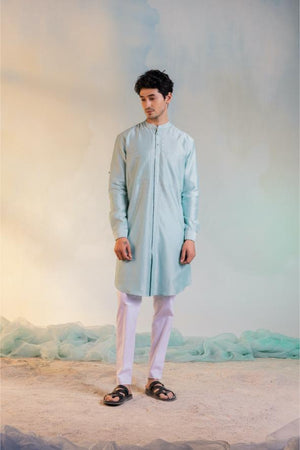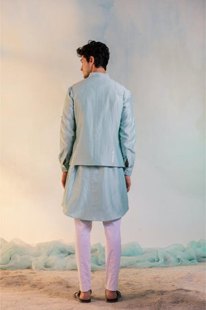 Comfort fit Double pocket front slit kurta in pastel green paired with straight white cotton lycra pants. This formal look can be completed with a chanderi sequin work Nehru jacket.