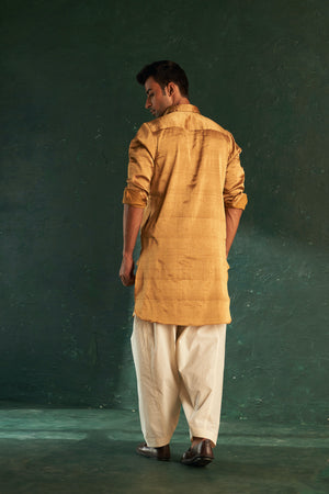 Our classic silk tissue pathani in gold is the perfect occasion wear. It features, classic shirt collar, loops on shoulder & folded sleeves and round shape bottom. Subtly enhanced with doriwork on pocket & has details for stripe silk tissue. The set come with a off white salwar and a pink stripe nehru jacket which makes it look more edgy.