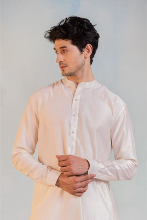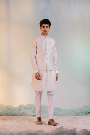 Comfort fit straight plain chanderi kurta in pastel blue, paired with straight white cotton lycra pants. This formal look can be completed with a chanderi sequin work Nehru jacket.