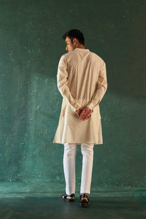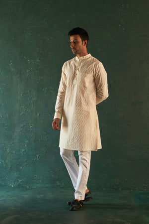 Our classic straight kurta in white chevron cotton is the perfect occasion wear. The kurta crafted in beautiful threadwork all over. It is paired with cotton pants and a white stripe tissue nehru jacket to make it look more edgy.