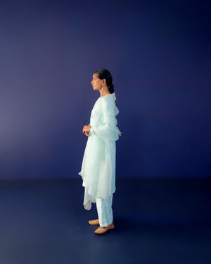 Powder Green Zari and Hand Pearl Embroidered Kurta Set with Pure Silk Organza Dupatta