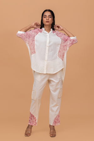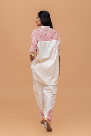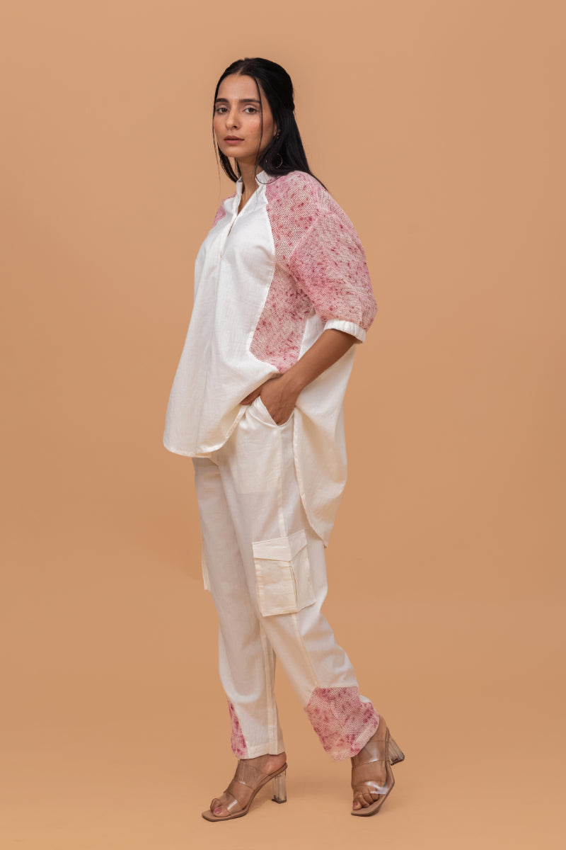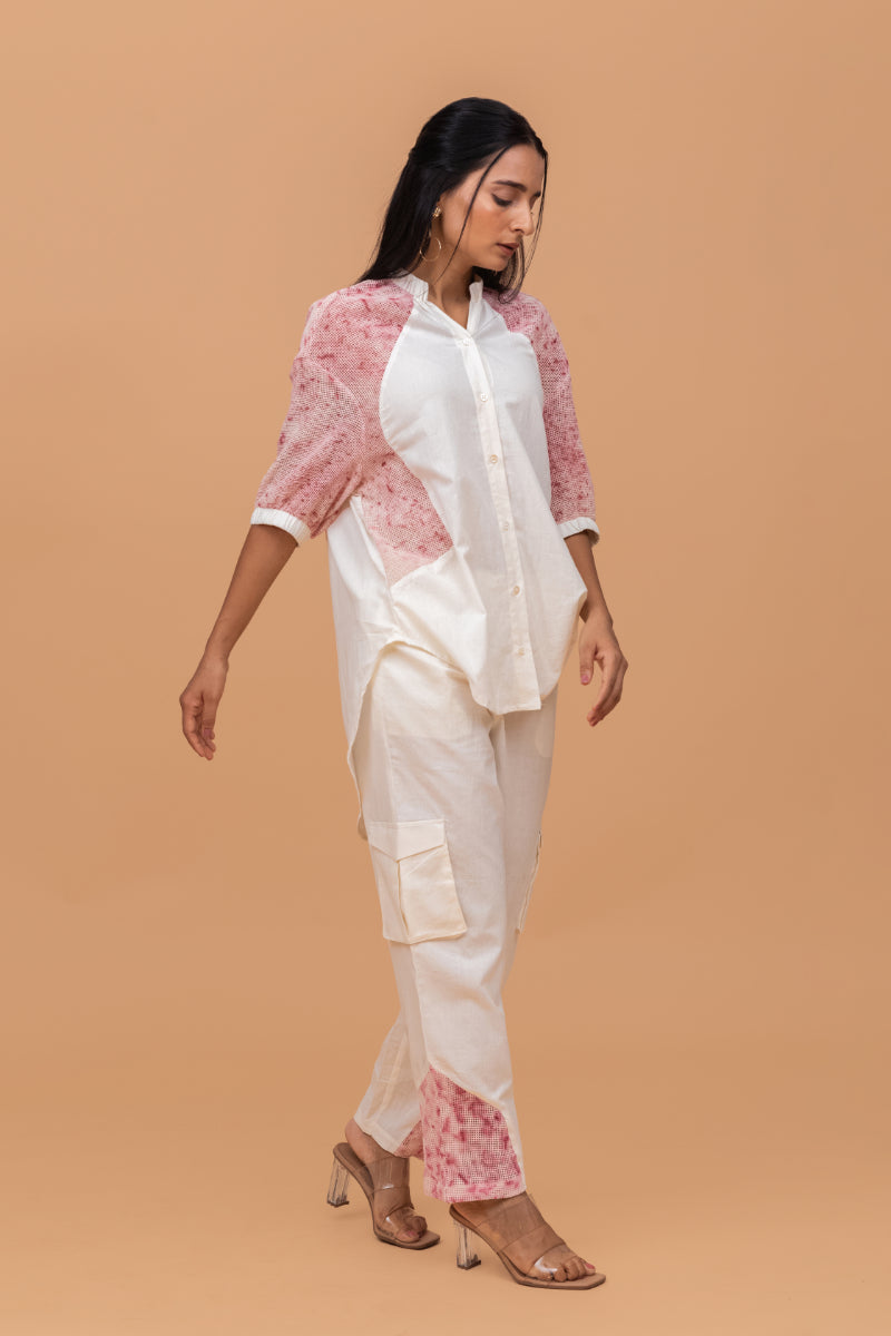 Eco-Printed Co-Ord Set, Crafted From Handwoven Khadi And Eco-Printed Organic Cotton Mesh, Is The Perfect Blend Of Comfort, Style, And Sustainability. The Breezy Fabric Ensures A Light, Airy Feel, While The Elastic Details On The Sleeves Add A Touch Of Modern Flair. The Coordinating Cargo Pants Offer A Relaxed, Functional Silhouette, Enhancing The Overall Look With Their Laid-Back Yet Trendy Appeal. Whether For Casual Outings Or For Formal Meetings, This Set Provides Effortless Elegance And Comfort, Making It A Must-Have Addition To Any Eco-Conscious Wardrobe.