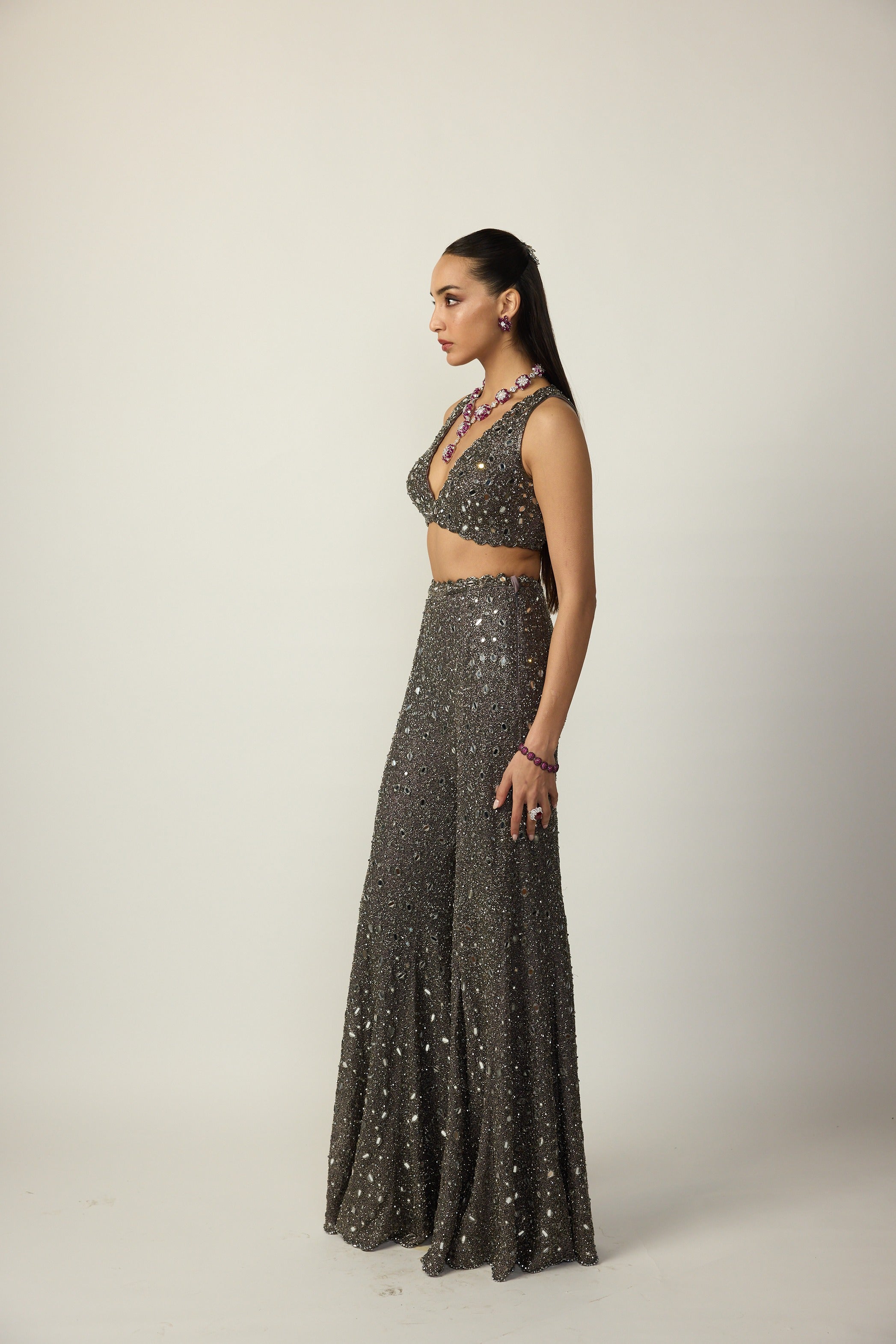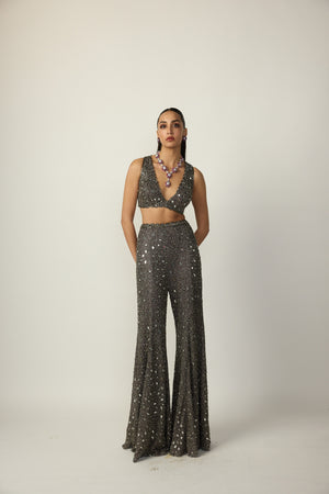 Metallic Grey Blouse and Sharara Pant Set with hand Cut Mirror and cut dana embroidery.
