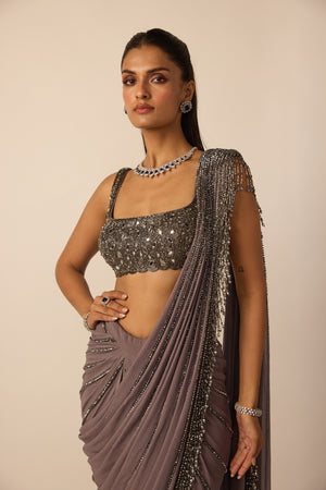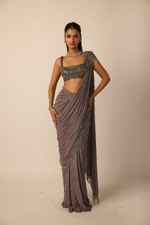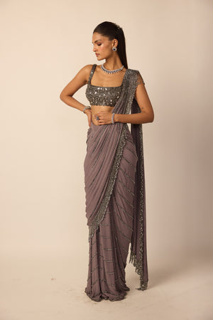 Metallic Grey Linear Draped Saree with Cascading Silver Tassels with a hand Cut Mirror and cut dana Embroidered blouse.