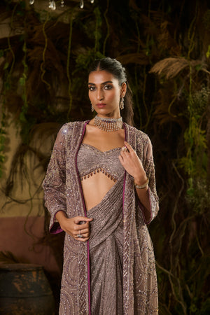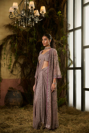 Metallic Grey Saree, Blouse And Long Embroidered Jacket