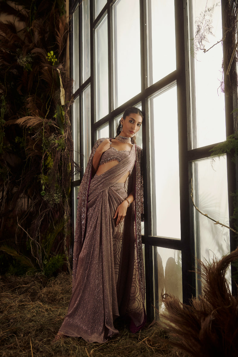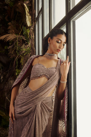 Metallic grey drapes saree with fluted blouse paired with sequence and crystal embroidered long jacket