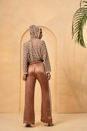 Featuring a mettalic rose gold co-ord set which contains a trouser and a top made of modal satin fabric and a hoodie made of Net. The ensemble is fully hand-embroidered with pearls, crystal stones and beads.