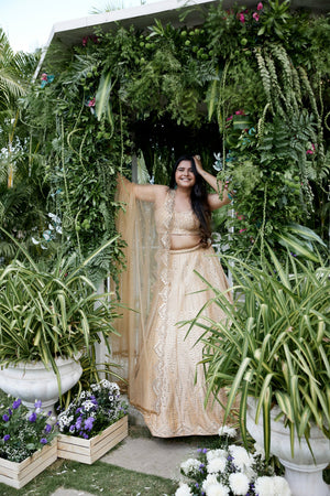 Gold Geometric Mirror And Leather Applique Embroidered Skirt In Dupion Silk Paired With A Spaghetti Blouse And Tulle Dupatta With Scallop Border And Pearls, Cutdana And Sequence Detailing.
