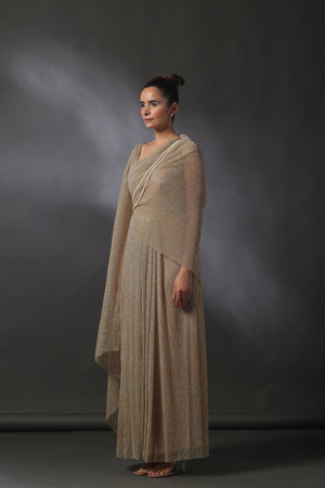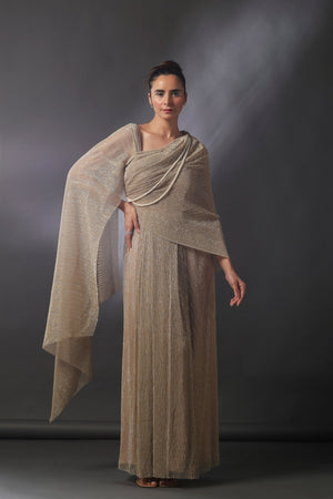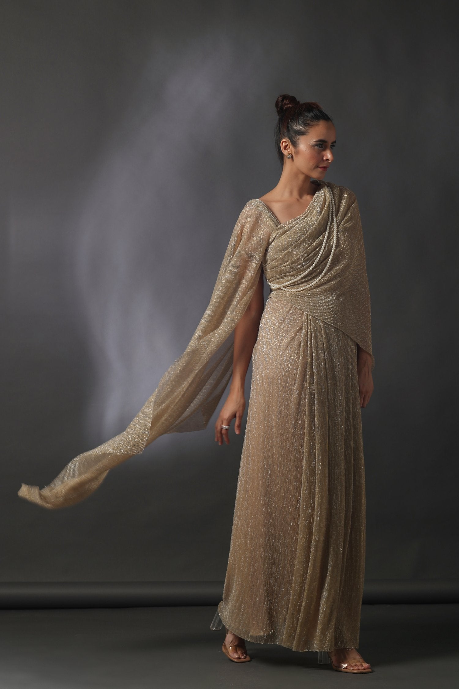 Look fine with dresses that shine. Seen here is a beautifully draped micro pleated gown in dull gold with a delicate pearl detail on the yoke.