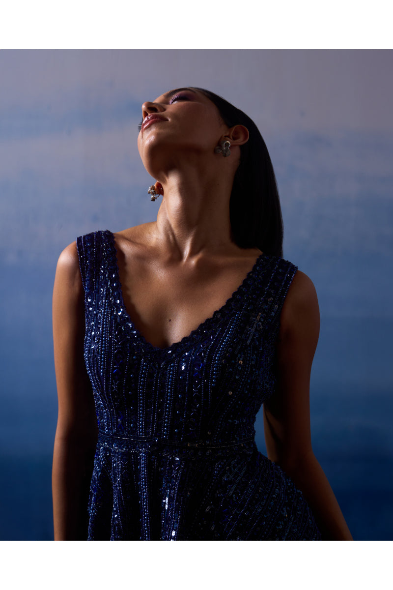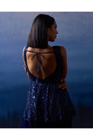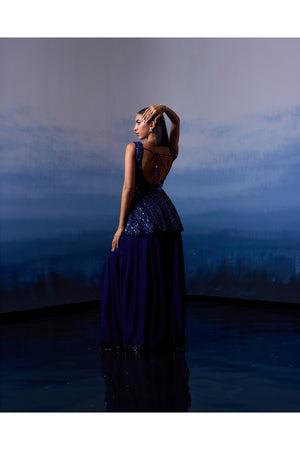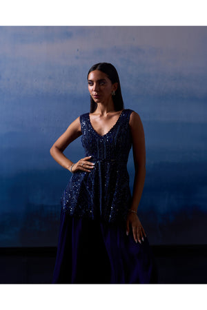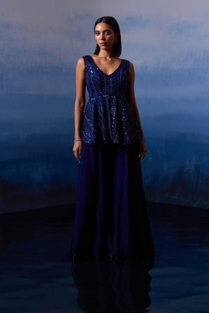 A midnight blue peplum set embroidered with bugle beads, sequins and crystals paired with an organza sharara.