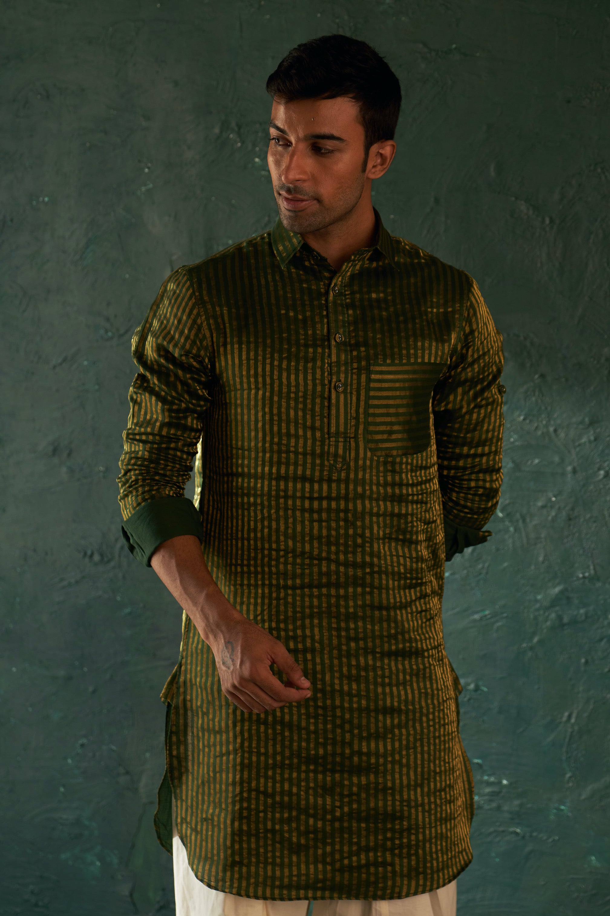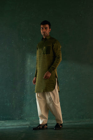 Our classic silk tissue pathani in deep green is the perfect occasion wear. It features, classic shirt collar, loops on shoulder & folded sleeves and round shape bottom. Subtly enhanced with doriwork on pocket & has details for stripe silk tissue. The set come with a off white salwar.