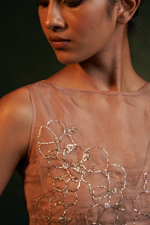 Those looking for understated glam look no further than this fawn Lehenga set made from delicate organza featuring gleaming embroidery, and handcrafted embroidered floral tassles. Paired with an abstract embroidered sleeveless blouse with a sheer organza back and organza dupatta with embroidered border all around.This muted toned heavily embroidered ensemble is a perfect balance between minimalistic and too much.