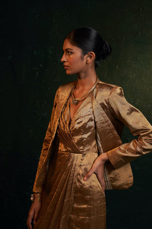 A Must Have is this contemporary Gold tissue blazer perfect for any formal events and functions, festive or weddings that adds up your glam quotient and also keeps you warm during those cold winter wedding nights. Pair it with a dress or saree and style it with our twisted knot neck piece.