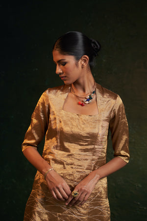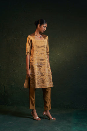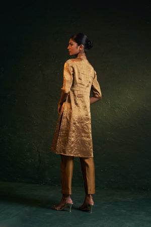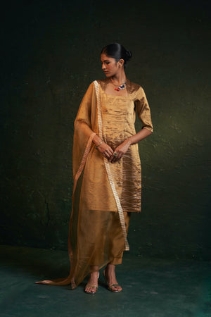 Set in regal gold tissue fabric in a modern sillhouette with an enchanting neckline this gold set is sure to become one of your treasured possessions. Contemporary dori embroidery adds to its minimaistic charm. It comes with chanderi pants and a delicate organza dupatta.