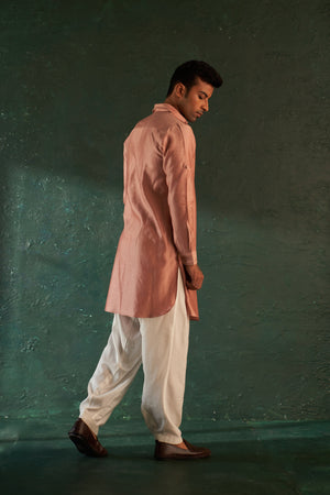 Our classic chanderi pathani in rose pink is the perfect occasion wear. It features, classic shirt collar, loops on shoulder & folded sleeves and round shape bottom. Subtly enhanced with doriwork on pocket & has details for stripe silk tissue. The set come with a white salwar.
