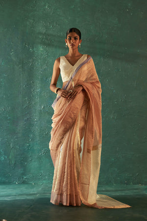 A colour mix gota infused striped saree with a contrasting border, paired with a striped tissue sleeveless blouse, perfect for any daytime event. Drape it the classic way or style it up as per the occassion. Add shimmer to your eyes along with any of our handcrafted jewellery pieces to glam up.