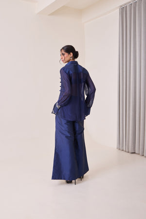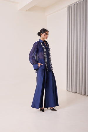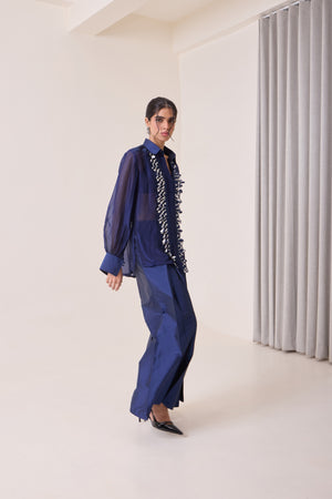 A navy organza shirt (Vegan Silk) detailed with intricate white and blue laser-cut appliqué across the front. The coloured panels add subtle dimension and texture, creating a balance of comfort and standout design — ideal for evenings or festive occasions.